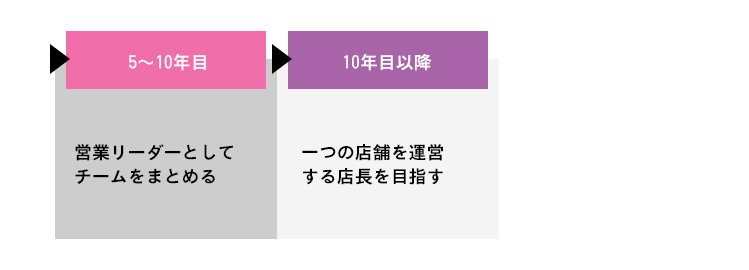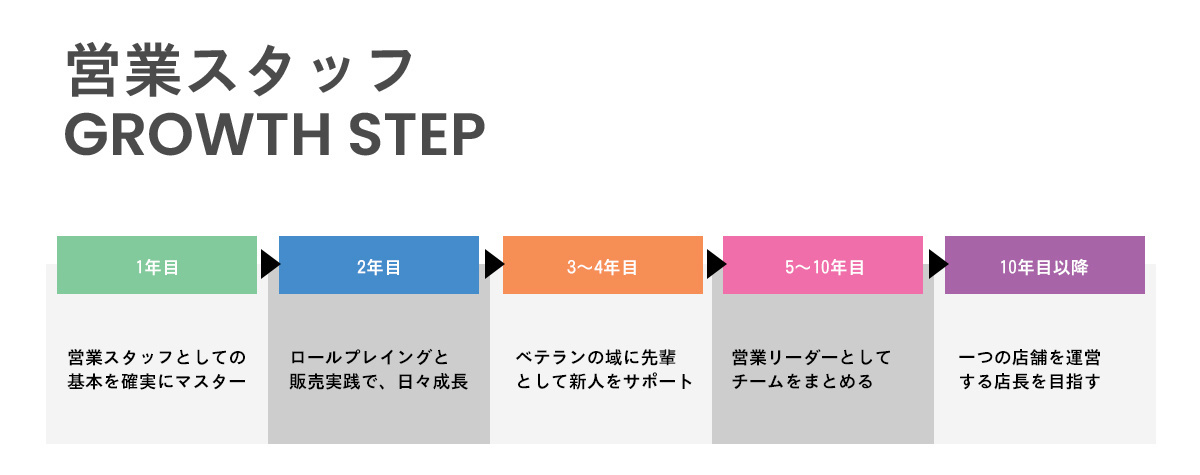目標は入社5年目以降で営業リーダーになること。展示会等の催事にも率先して取り組み、10年目以降は店長としてマネジメントや計数管理などを行うひとつ上のステージを目指します。