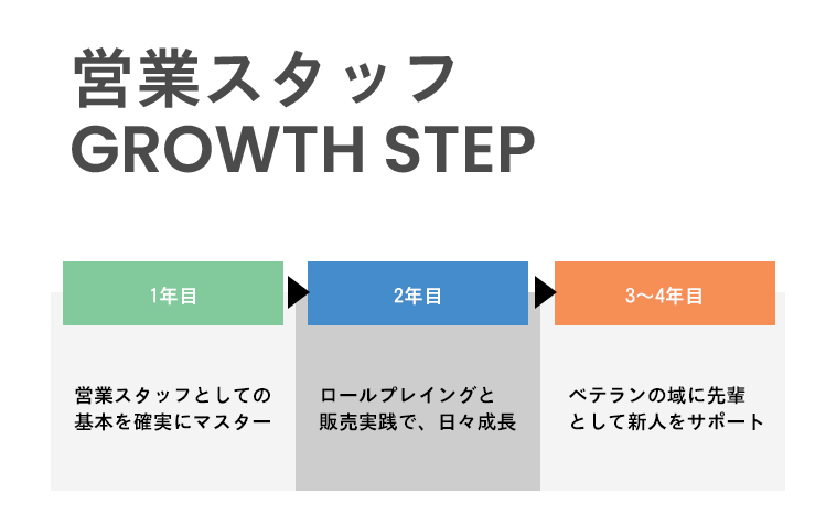 お客様の来店から商談・契約・納車・アフターフォローまでの営業の流れや、仕事の基本を学んだ後、査定や保険などの知識や技術を身につけ、資格を取得します。